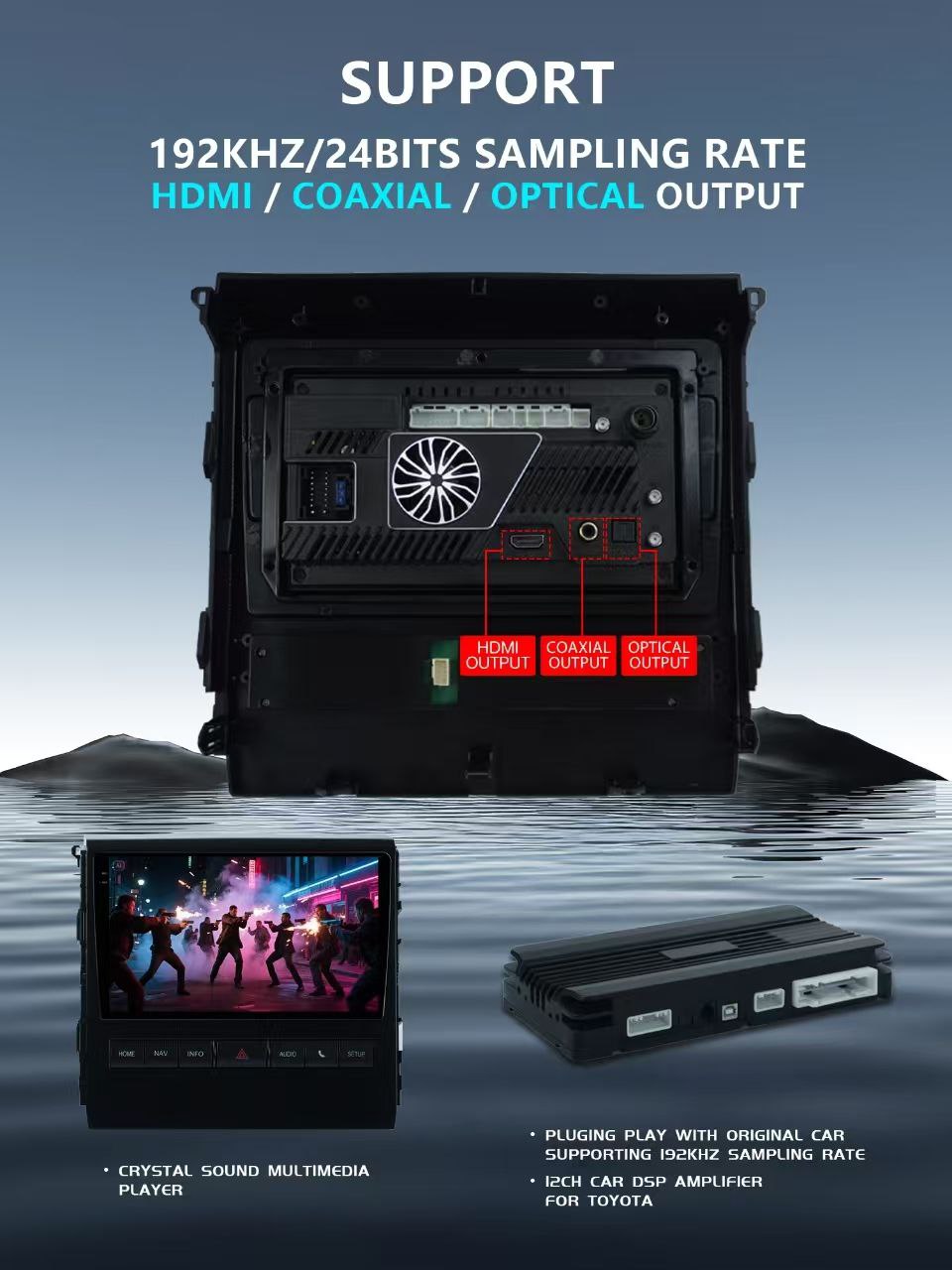 - Bluetooth/радио/GPS и все приложения играют через выходы USB/OPT/COAX/HDMI в исходном коде.