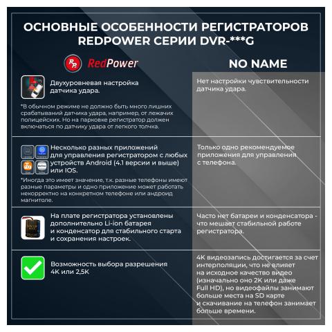Компания Redpower рада представить новую линейку штатных регистраторов DVR-G серии. Отличия от N серии: новый чип позволяет записывать видео в разрешении 2K (было Full HD), новый сенсор Sony 335, возможность подключения GPS антенны и встроенный конденсатор.
